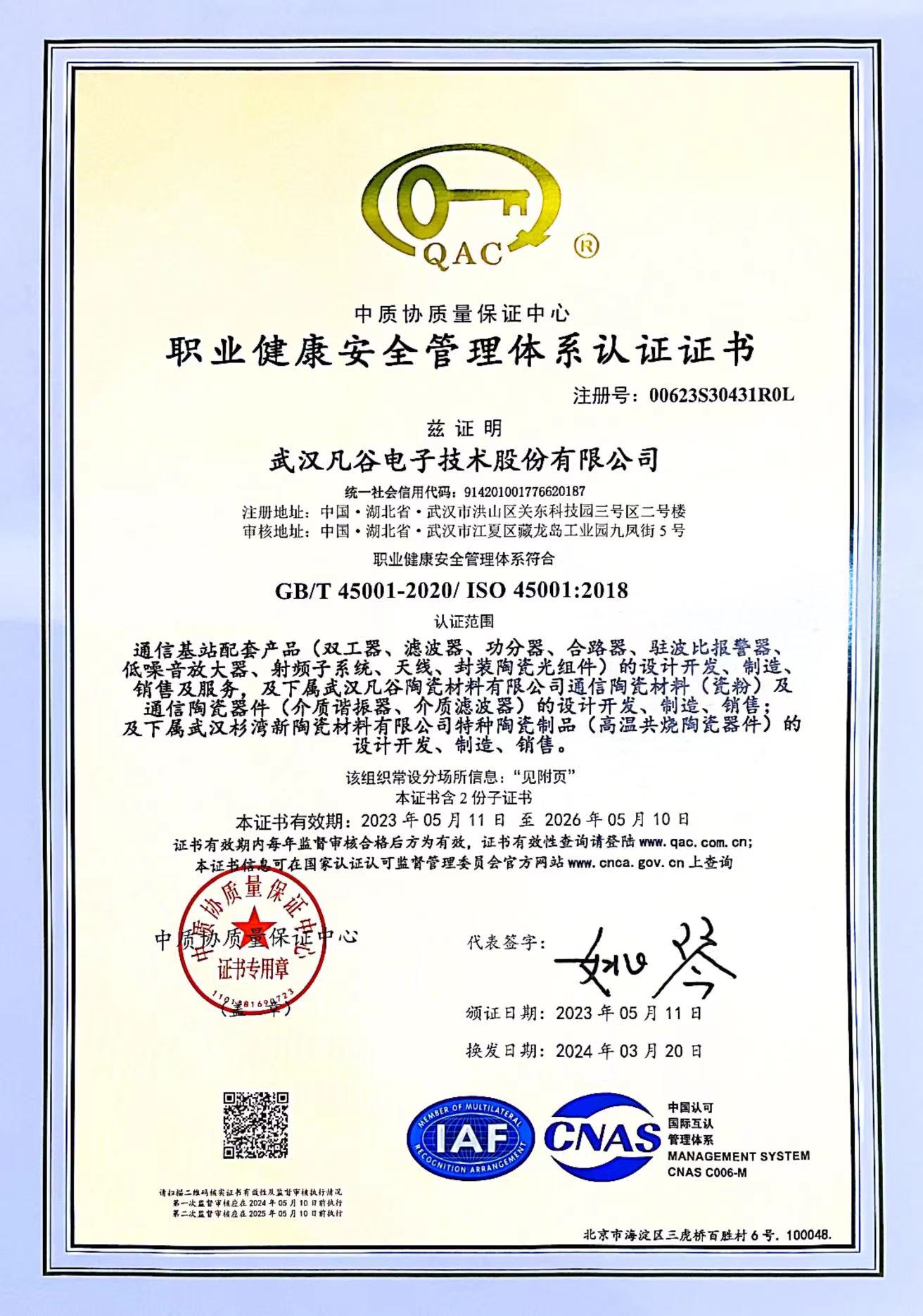 公司自2014年通過OHSAS18001職業(yè)健康安全管理體系認證,目前保持有ISO45001:2018管理體系認證證書。